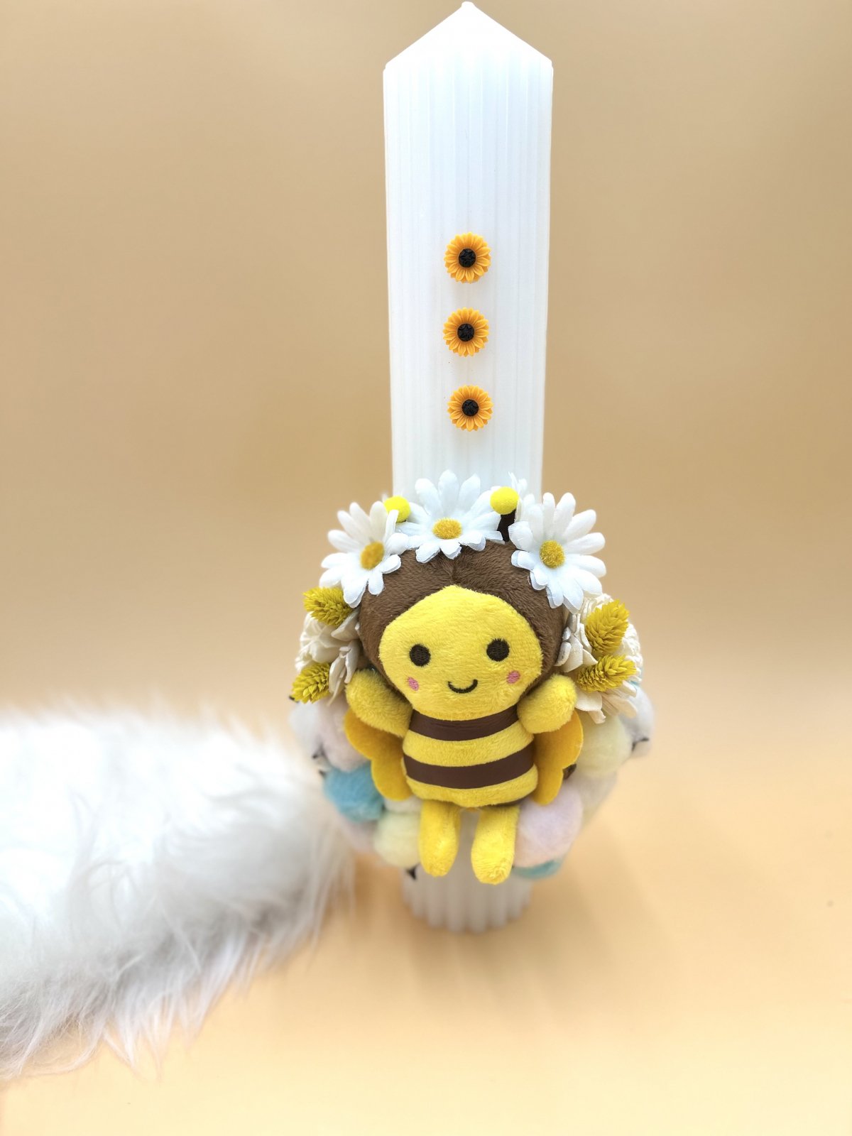 Lumânare decorativă realizată manual din ceară naturală premium, cu un personaj albinuță drăgălaș atașat în jurul căreia se găsesc flori albe, într-un design unic și vesel.