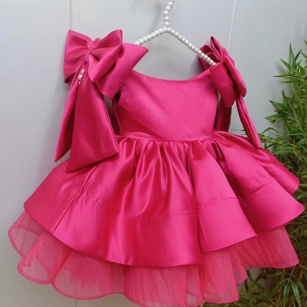 Rochie elegantă din satin roz pentru fetițe 4–5 ani, cu funde decorative pe umeri și fustă amplă cu strat de tul. Ideală pentru aniversări, petreceri, serbări sau evenimente speciale. O rochie deosebită, cu aspect de prințesă, confortabilă și spectaculoasă.