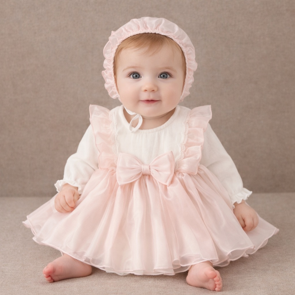 Rochia vine însoțită de o bonetă asortată, un accesoriu rafinat și delicat, potrivit pentru botez sau pentru completarea ținutei în ședințele foto. Boneta este realizată din același material moale și confortabil, având detalii fine din tulle roz pudrat, care se armonizează perfect cu designul rochiei. Aceasta oferă un plus de stil și eleganță, transformând ținuta într-un ansamblu complet și impecabil.