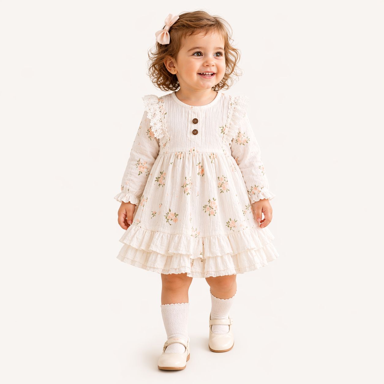 Culoarea crem deschis, combinată cu imprimeul floral în tonuri pastel, face ca această rochiță să fie ușor de asortat și potrivită pentru diferite stiluri. Poate fi purtată cu pantofi eleganți, balerini sau sandale, în funcție de ocazie. Este ideală pentru evenimente speciale precum aniversări, botezuri, ședințe foto sau întâlniri de familie, dar și pentru plimbări sau momente de zi cu zi în care vrei ca fetița ta să arate deosebit.
