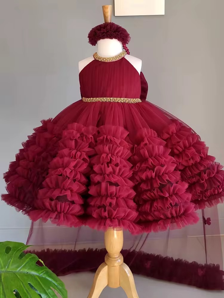 Rochiță Satin Fetițe Burgundy cu Tulle Voluminos și Trenă Asimetrică – Model Elegant pentru Ocazii Speciale