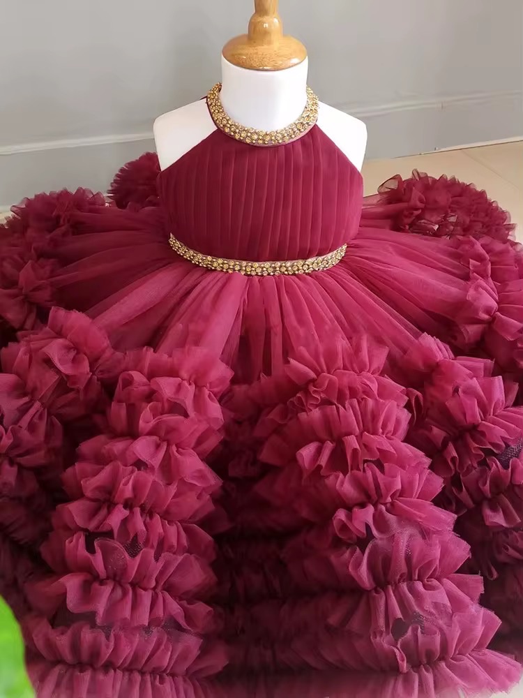 Fusta rochiei este compusă din două secțiuni, ceea ce o diferențiază de modelele clasice. Prima parte este o fustă scurtă, amplă, formată din straturi dense de tulle burgundy bogat. Acest tulle este plin, aerat și foarte ușor, cu pliuri voluminoase care creează un efect pufos și jucăuș. Straturile multiple sunt dispuse uniform, iar marginile sunt atent finisate pentru un aspect premium. Această parte a fustei îi permite copilului să se miște liber, să danseze și să se învârtă, fără a compromite eleganța generală a ținutei.