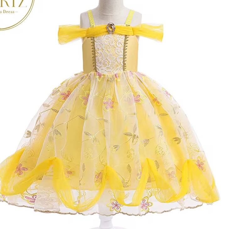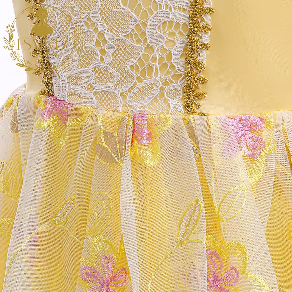 Fusta rochiei este realizată din mai multe straturi de tulle moale, ușor și vaporos, care creează un aspect amplu și diafan. Tulle-ul galben pastel are un imprimeu discret floral, care aduce un plus de unicitate și rafinament. Florile sunt mici, delicate și plasate uniform, oferind fustei un aspect plin de luminozitate și farmec. Stratul superior de tulle are marginile stilizate în valuri elegante, care creează un efect de mișcare și fluiditate, perfect pentru fetițele care adoră să se învârtă.