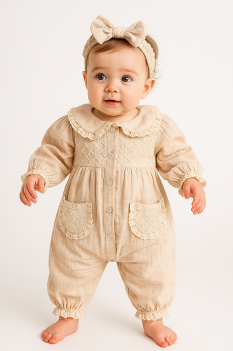 Design încântător: Salopeta este decorată cu detalii delicate, precum gulerul cu volănașe și buzunărașele adorabile, oferind un aer dulce și sofisticat. Bentița asortată completează perfect ținuta, adăugând un plus de eleganță.