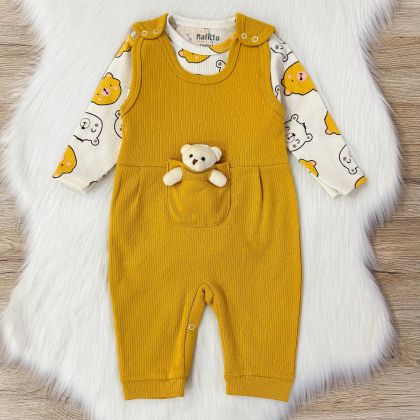 Set adorabil pentru bebeluși: Salopetă galbenă cu ursuleț și body asortat