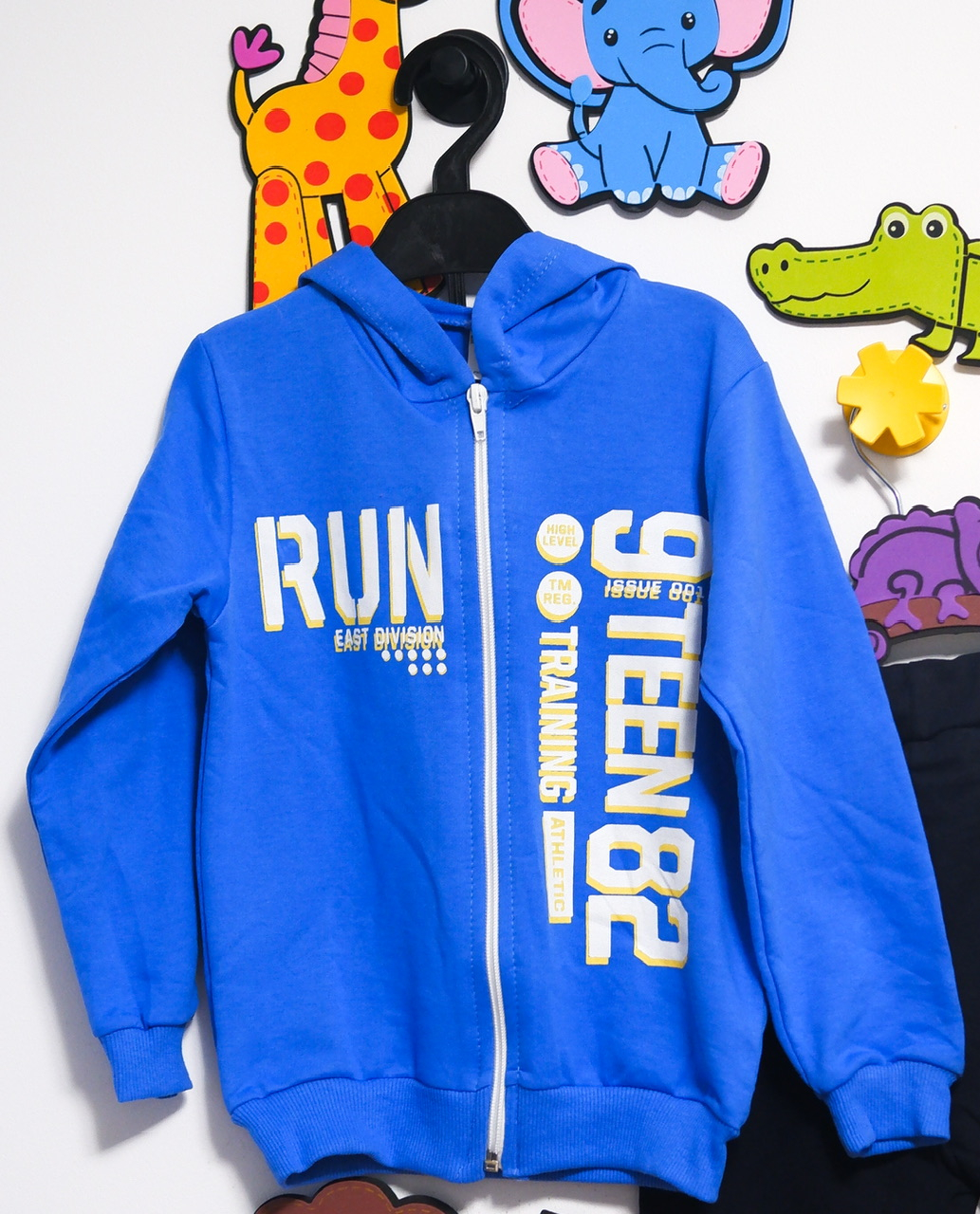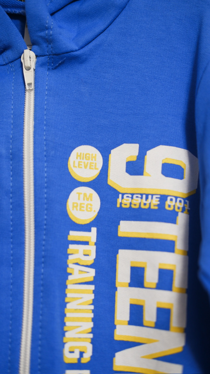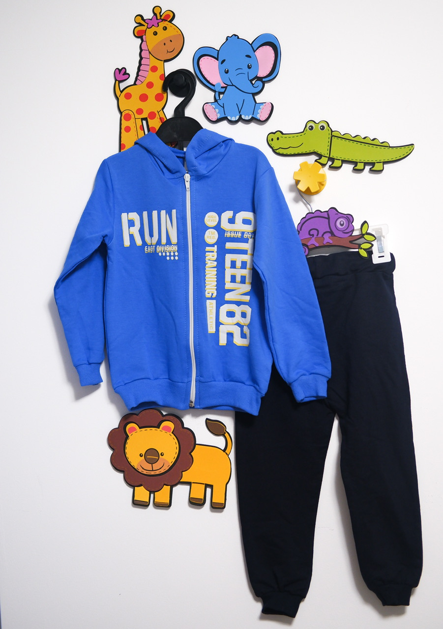 Setul se remarcă prin combinația de culori moderne și vibrante: hanoracul albastru electric cu fermoar și imprimeu sportiv „RUN NTEEN 82 TRAINING”, completat de o pereche de pantaloni negri simpli, care echilibrează perfect ansamblul. Stilul este casual-sport, inspirat din moda urbană pentru copii, fiind potrivit atât pentru școală, cât și pentru activitățile zilnice.