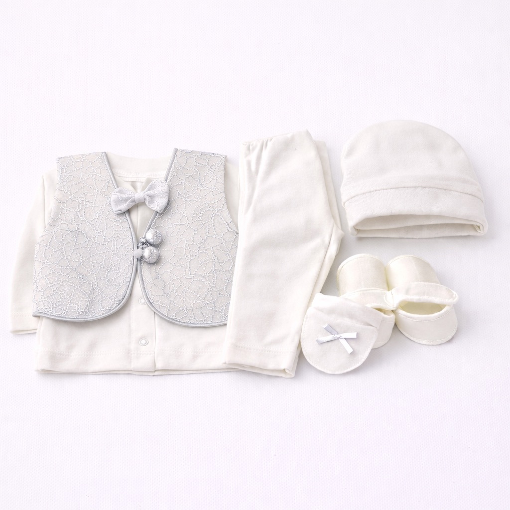 Set hăinuțe botez băiețel, elegant, alb-crem, cu vestă brodată – 5 piese