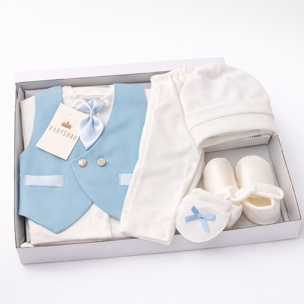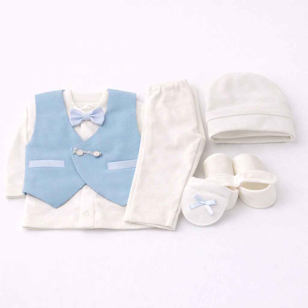 Set de botez elegant pentru băiețel, potrivit vârstei 0–3 luni, compus din cămașă albă, vestă bleu cu papion asortat, pantaloni comozi, căciuliță, botoșei și mănuși. Realizat din materiale moi, ideale pentru pielea sensibilă a bebelușului, perfect pentru ceremonia de botez și ședințe foto.