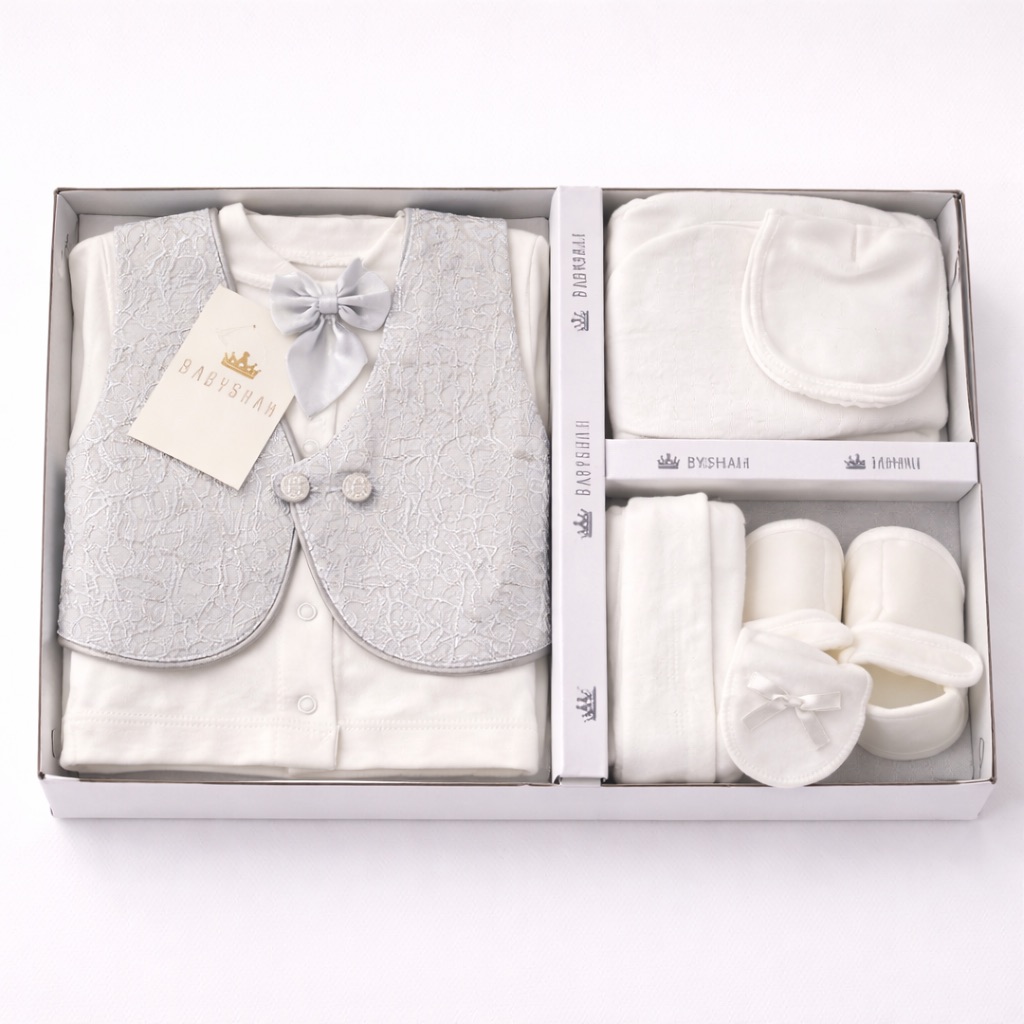 Set de botez elegant pentru băiețel, recomandat vârstei 0–3 luni, prezentat în cutie cadou. Include cămașă albă, vestă gri-argintiu cu textură rafinată, papion asortat, pantaloni, căciuliță, botoșei și mănuși. Ideal pentru ceremonia de botez, realizat din materiale moi, confortabile pentru pielea sensibilă a bebelușului.