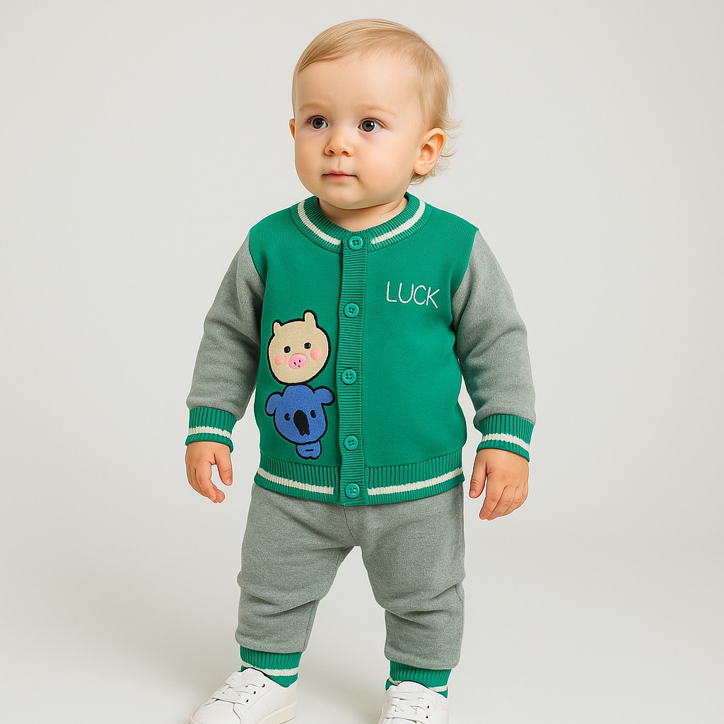 Designul setului tricotat 2 piese pentru copii verde îmbină simplitatea cu detaliile moderne. Puloverul are un croi clasic, cu nasturi frontali, guler rotund și margini elastice care asigură o potrivire perfectă. În partea din față, imprimeul jucăuș cu personaje colorate și textul „LUCK” adaugă o notă veselă și originală, transformând ținuta într-una plină de viață. Nuanța de verde intens se combină elegant cu griul neutru al pantalonilor, oferind un contrast plăcut și o imagine echilibrată.