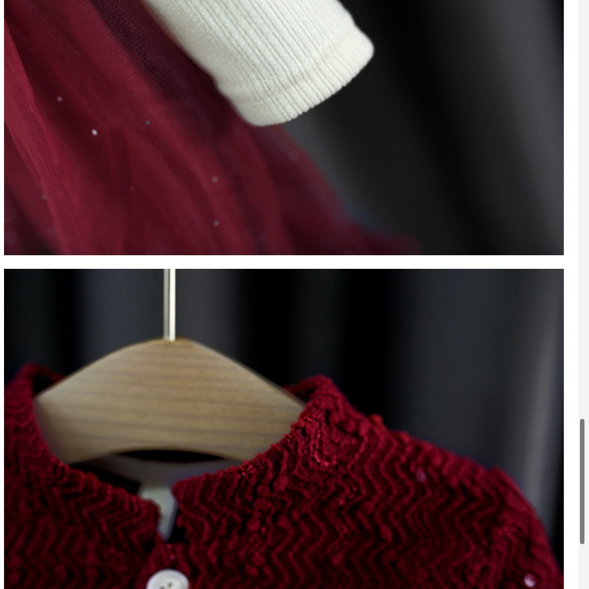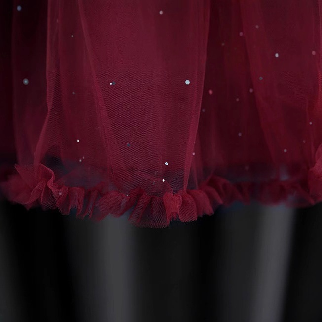 Prima piesă a setului este rochița bordo, lucrată cu atenție la detalii, din materiale de calitate superioară. Fusta este realizată din straturi multiple de tul fin, care creează volum, eleganță și un efect diafan la fiecare pas. Este o rochiță ideală pentru fetițele care adoră să se învârtă, deoarece fusta se așază extraordinar de frumos și creează o mișcare fluidă.