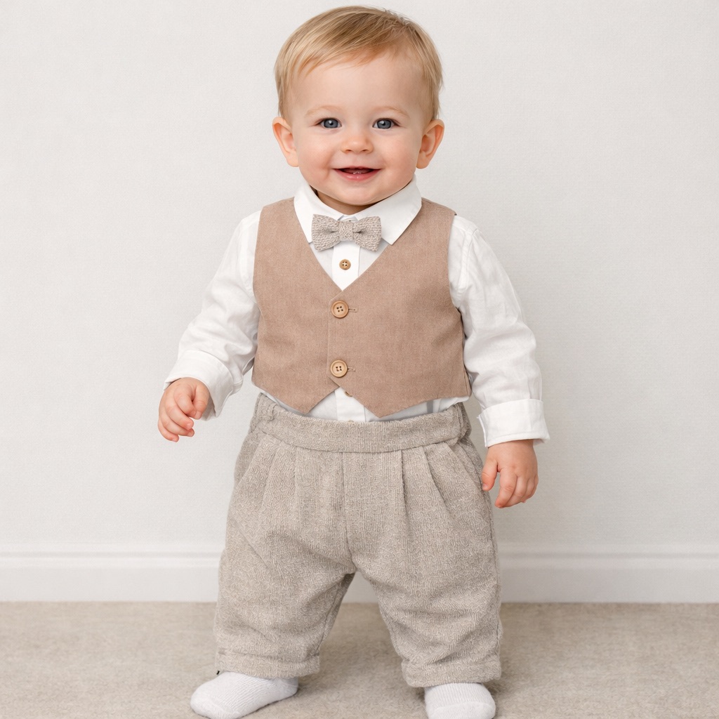 Set elegant pentru băieți cu pantaloni, papion, vestă și body cămașă din bumbac fin, ideal pentru botez, aniversări și ocazii speciale. Materiale sigure pentru pielea sensibilă și design modern pentru evenimente memorabile.
