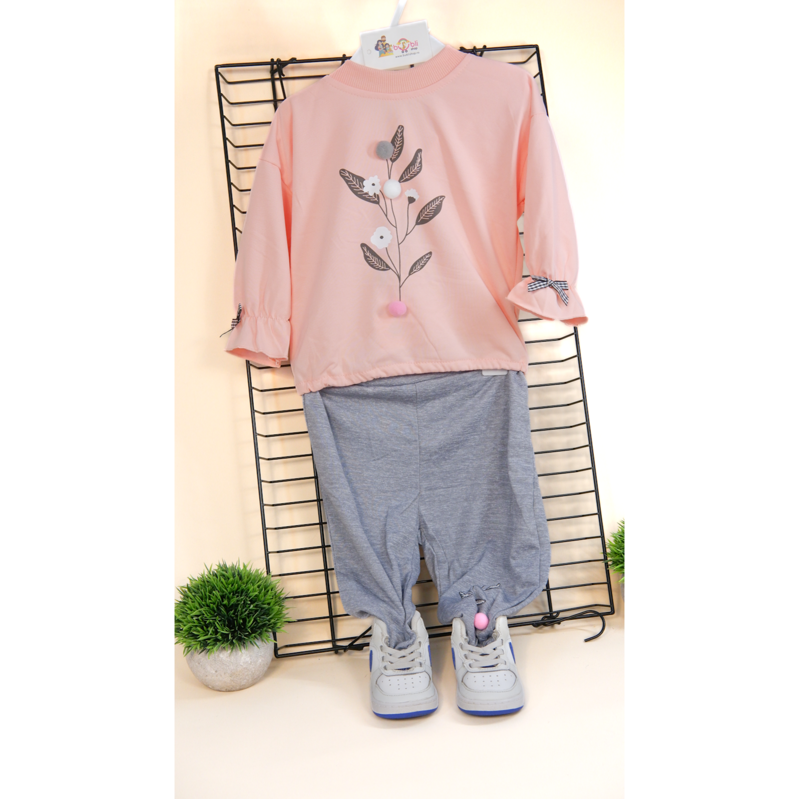 Set Fetiță – Bluziță Roz cu Mâneci Bufante și Pantaloni Gri cu Detalii Florale Aplicate – Îmbrăcăminte Confortabilă și Delicată pentru Zile de Poveste