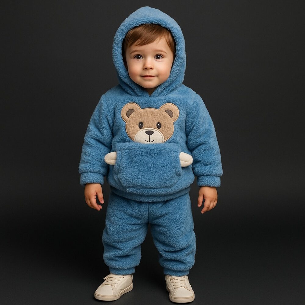 iarnă copii albastru, foarte călduros și confortabil, creat special pentru sezonul rece. Realizat din material pufos și moale la atingere, setul include hanorac cu glugă și pantaloni asortați, oferind protecție termică optimă și libertate de mișcare. Designul drăguț cu ursuleț adaugă un plus de stil, fiind ideal pentru plimbări zilnice, joacă în aer liber sau activități de iarnă. Un set de iarnă pentru copii practic, călduros și ușor de purtat, potrivit pentru bebe și copii mici.