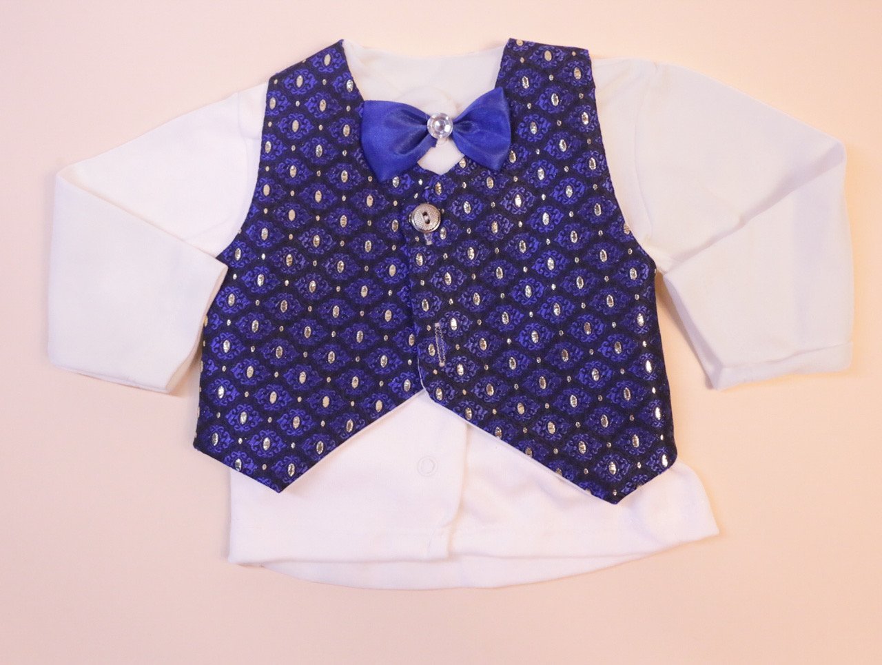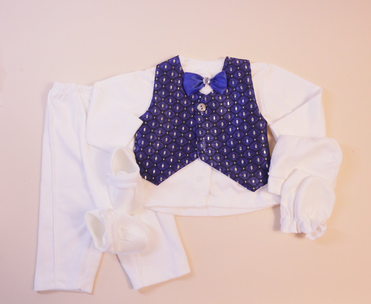 Alege un set adorabil pentru nou-născuți băieței 0-3 luni, cu bluză albă cu papion, vestă albastră, pantaloni, pantofiori, mănuși și căciuliță, toate din bumbac 100% moale și delicat.