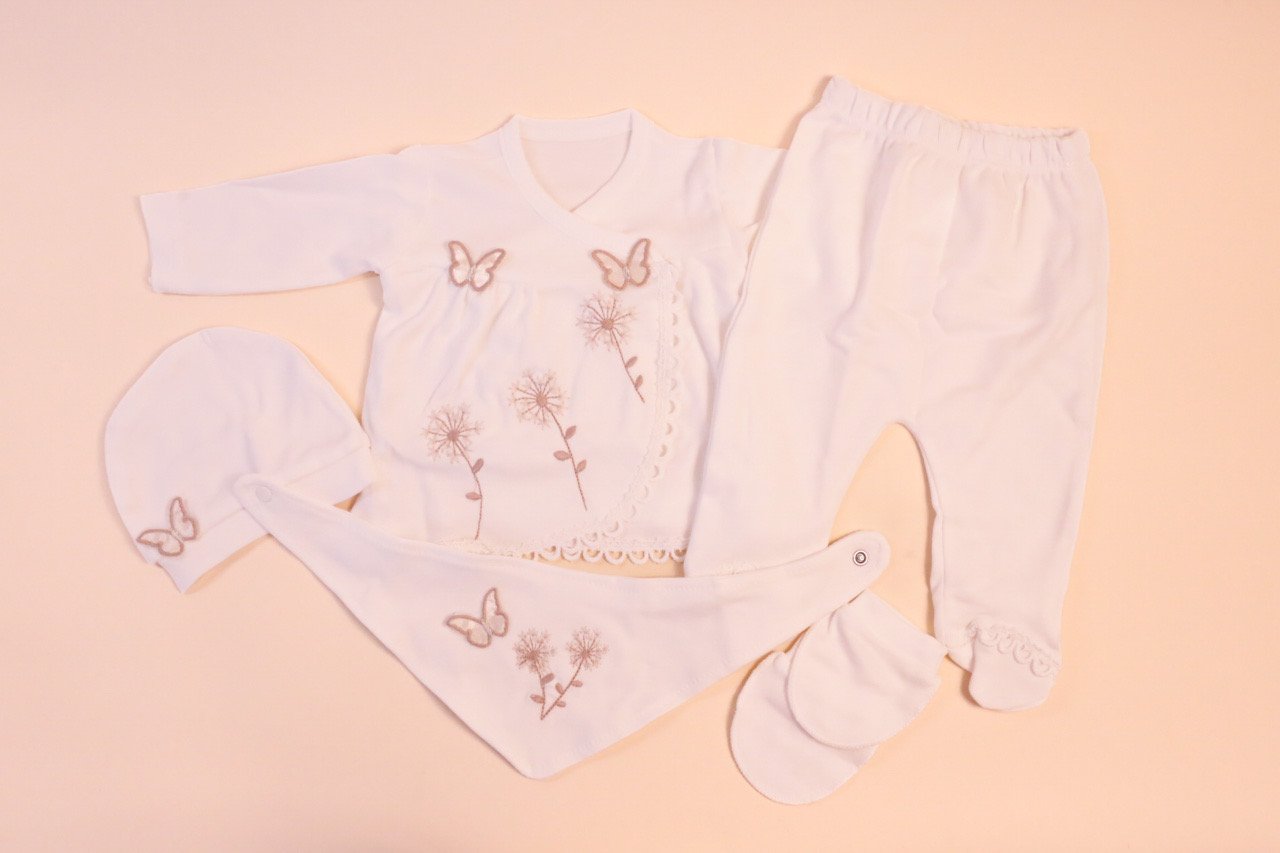 Set nou-născut fetițe 0-3 luni – 5 piese din bumbac moale cu fluturi și floricele