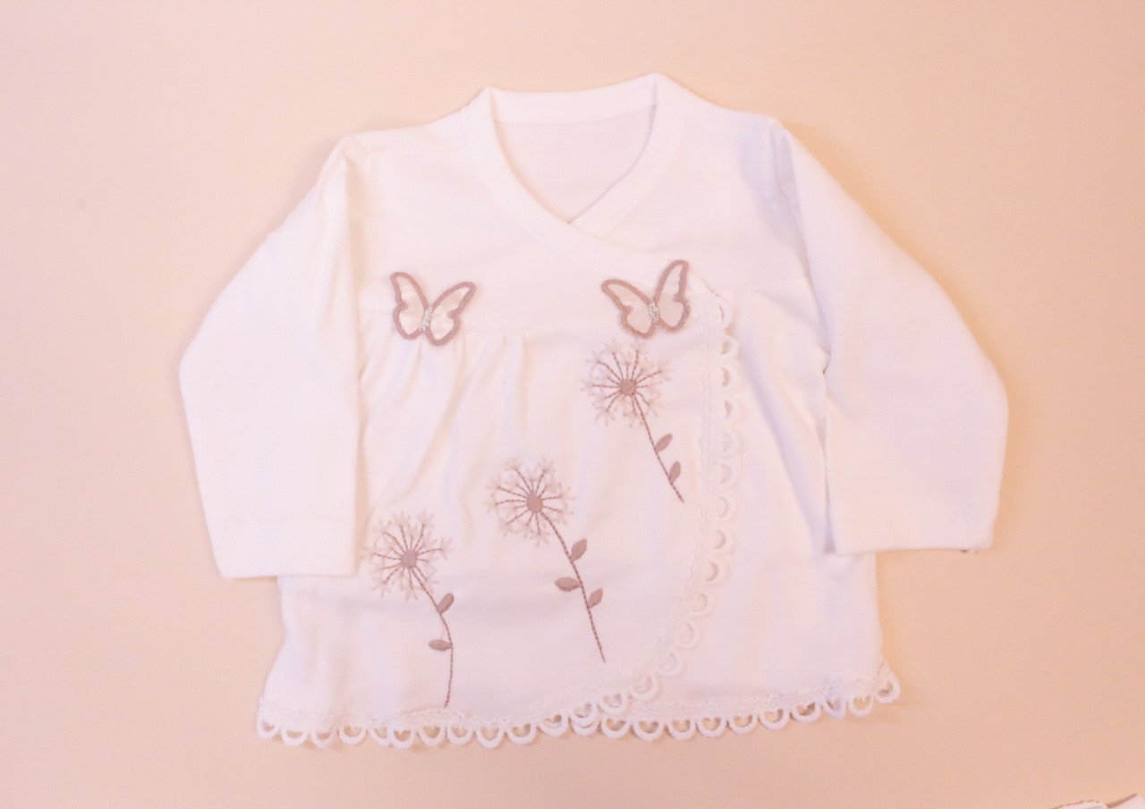 Designul este rafinat și feminin, cu broderii discrete în nuanțe crem, reprezentând fluturi și floricele, simboluri ale purității și delicateții copilăriei. Setul este realizat într-o nuanță alb-lăptoasă caldă, ușor de asortat, ideală pentru botez, aniversări sau ca ținută confortabilă de zi.
