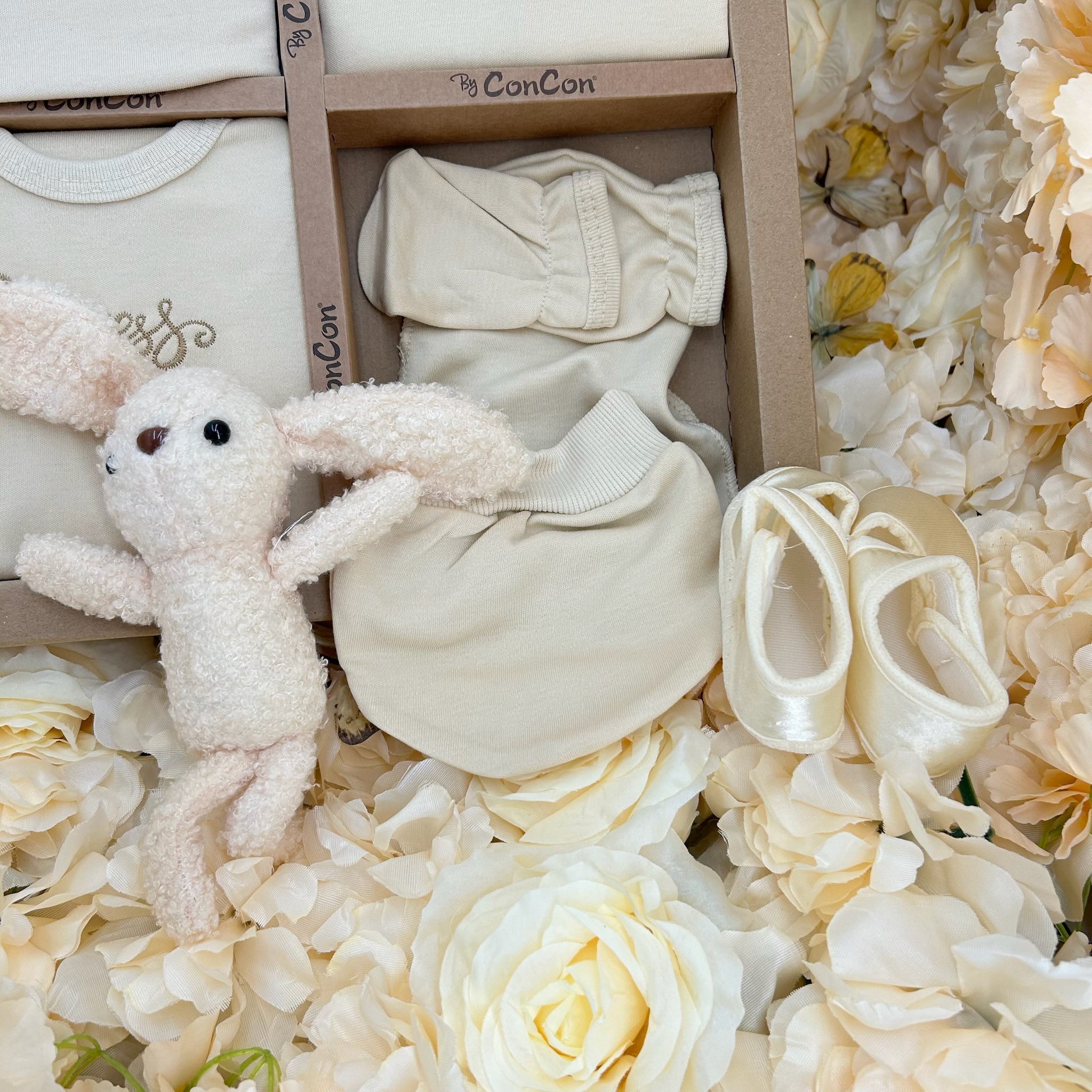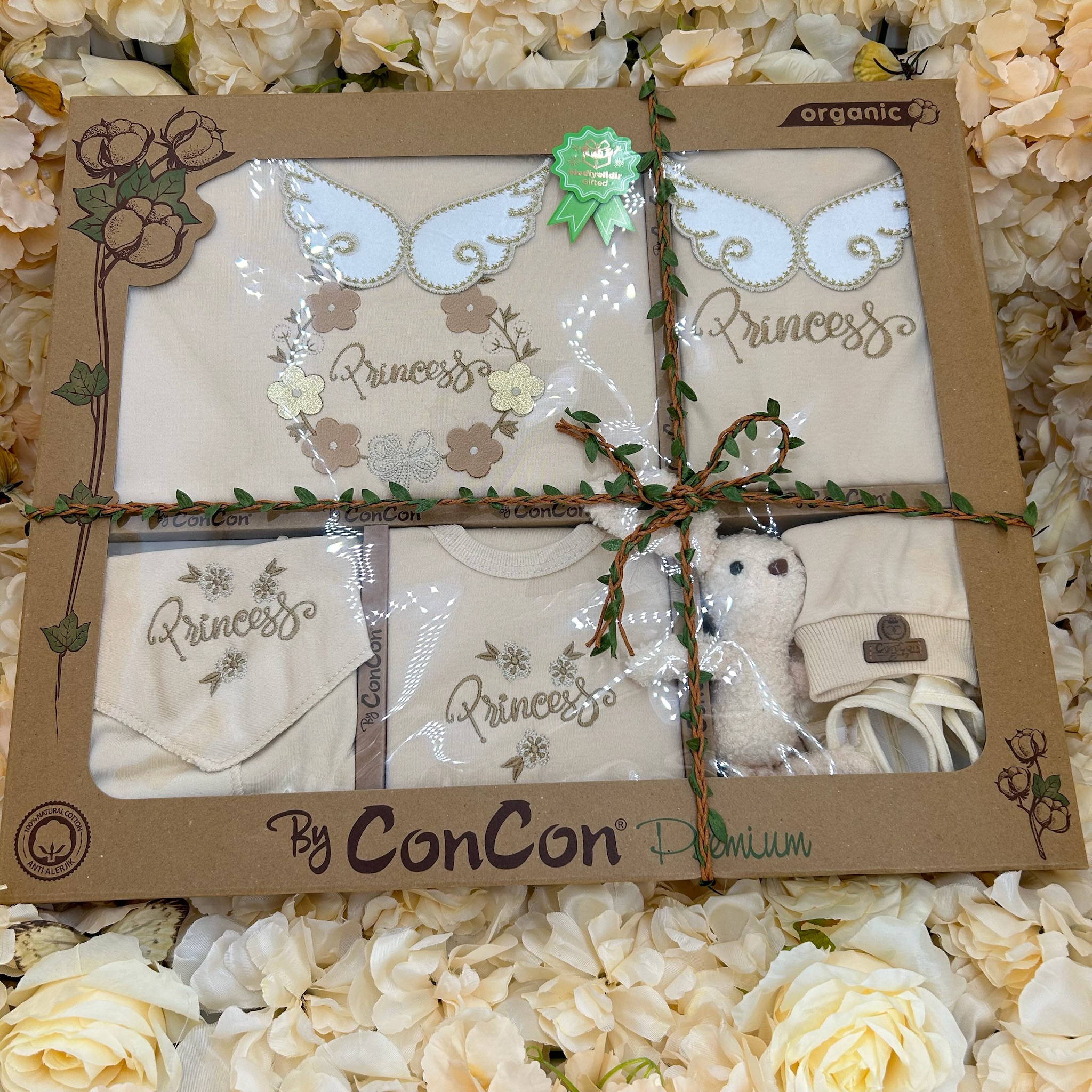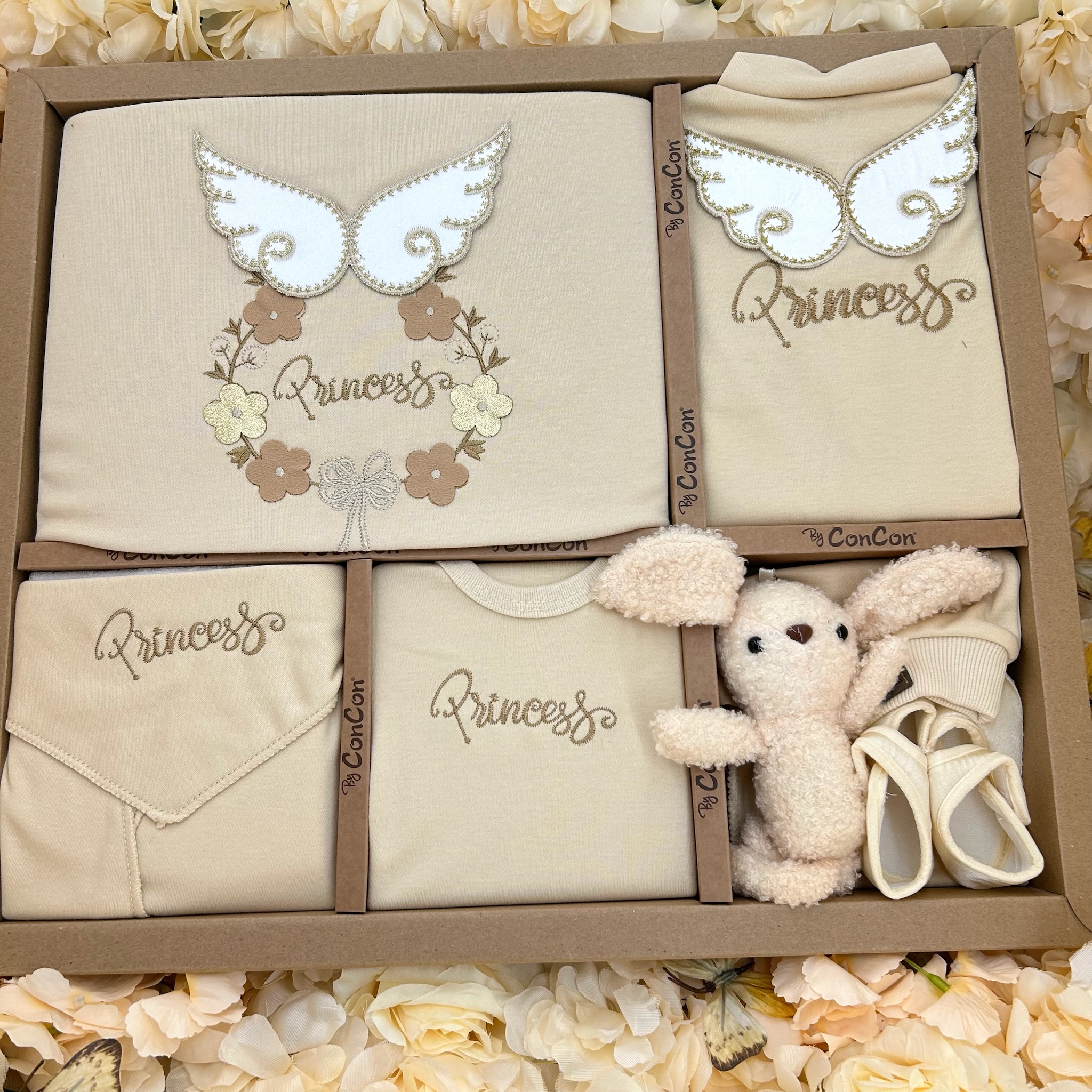 Ambalarea setului este elegantă și premium, astfel încât să poată fi oferit direct cadou. Fiecare piesă este aranjată cu grijă într-o cutie decorativă, ideală pentru baby shower, botez sau pentru a întâmpina bebelușul acasă. Designul setului Princess pune accent pe nuanțele naturale și pe broderiile delicate, inspirate din tema regală. Fiecare detaliu este creat pentru a pune în valoare gingășia bebelușei și pentru a oferi o experiență completă părinților.