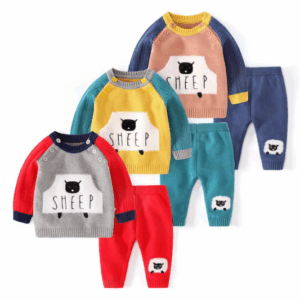 Acest set tricotat în nuanțe de albastru și crem este alegerea perfectă pentru zilele reci, oferind confort, căldură și un design vesel potrivit atât pentru băieți, cât și pentru fete. Realizat dintr-un tricot moale și plăcut la atingere, setul este format din două piese – un pulover cu model de miel și pantaloni asortați – create special pentru a menține copilul călduros, liber în mișcare și elegant în același timp.
