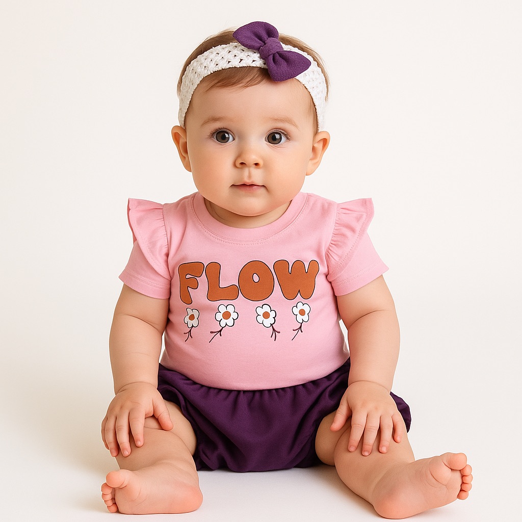 Set de vară pentru fetițe format din tricou, pantaloni scurți și bentiță. Bumbac moale, culori vesele și confort ideal pentru 6–24 luni.