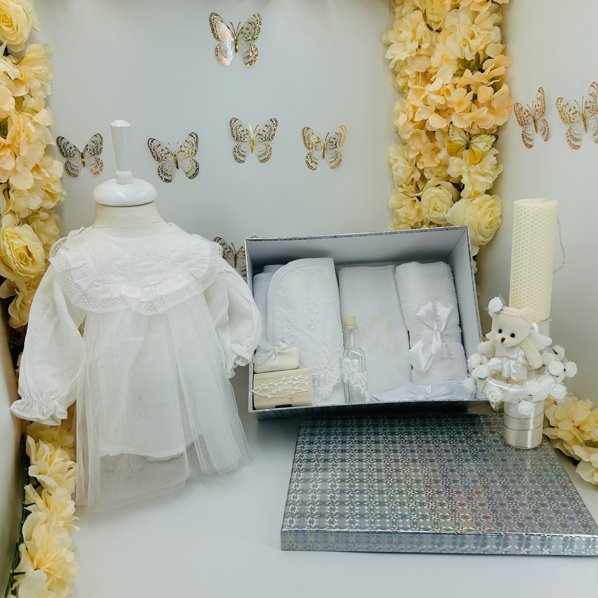 Trusou de botez pentru fetițe 0–3 luni, pregătit complet pentru ceremonie: rochiță albă cu mânecă lungă și dantelă, pălărioară asortată, prosop și pânză pentru botez, sticluță pentru mir, săpun, cutiuță pentru prima șuviță și lumânare lucrată manual din ceară naturală tip fagure, decorată delicat. Livrat într-o cutie cadou elegantă, perfectă pentru un dar deosebit.