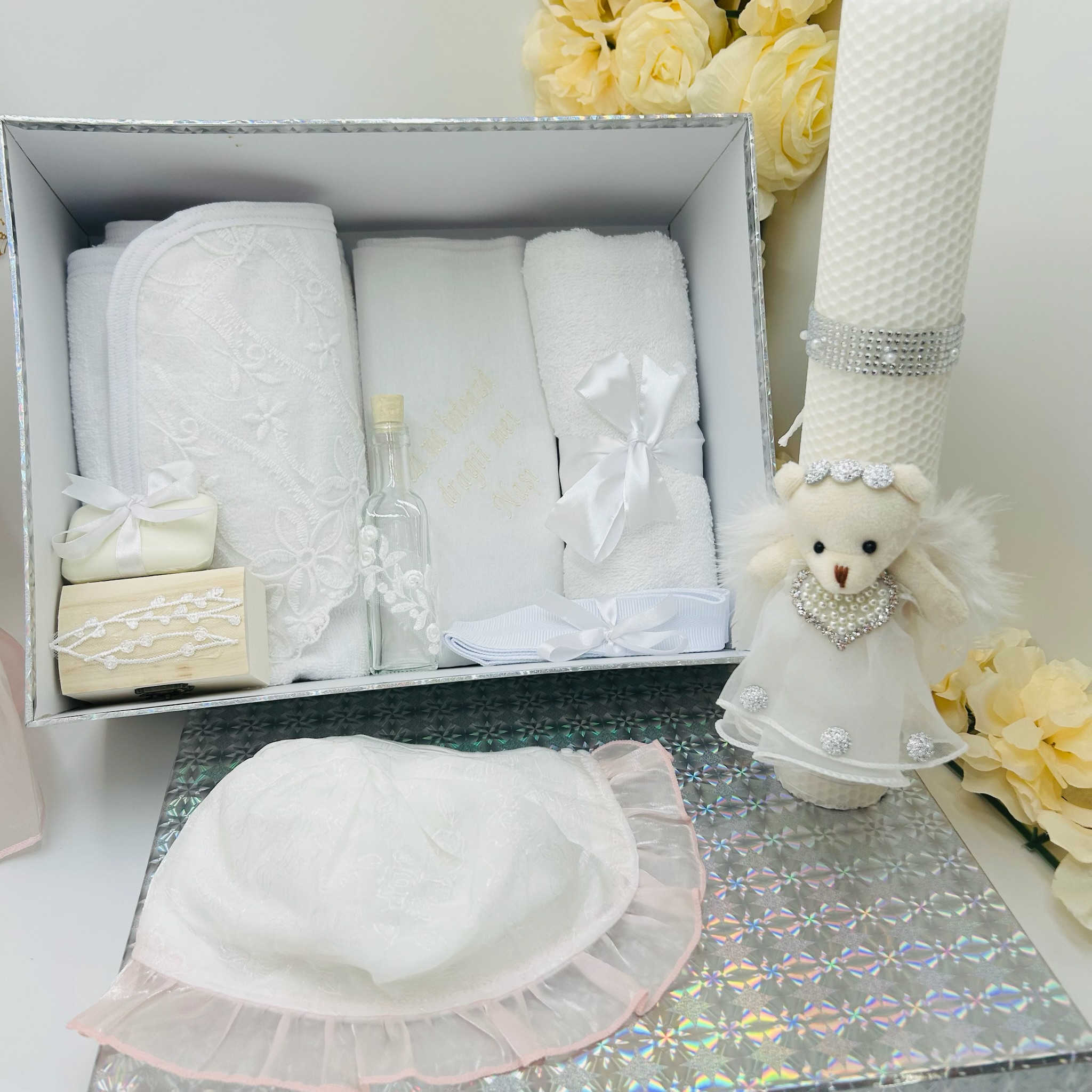 Trusou botez fetiță 0–3 luni complet, cu rochiță albă, lumânare din ceară naturală tip fagure și cutie cadou elegantă