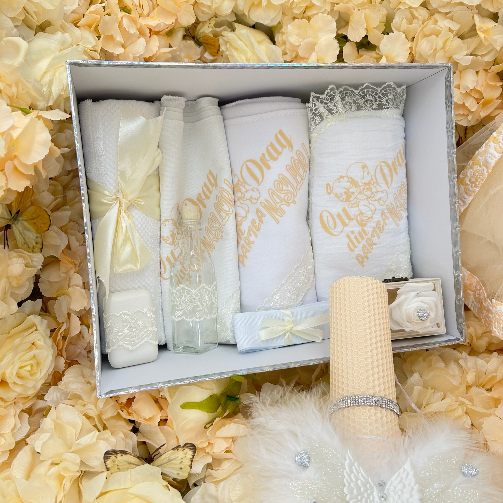 În trusoul de botez se regăsesc și textilele esențiale pentru ceremonie, în alb, cu accente aurii și finisaje elegante. În imagini se observă prosoape rulate frumos, cu borduri din dantelă și un mesaj decorativ auriu, potrivite pentru momentul ritualului și pentru păstrarea ca amintire. Texturile par moi și plăcute la atingere, fiind alese pentru confortul bebelușului. De asemenea, setul include pânza de mir (crismă), realizată în alb, cu detalii fine, precum și o fașă/panglică pentru botez, în tonuri deschise, care completează setul.