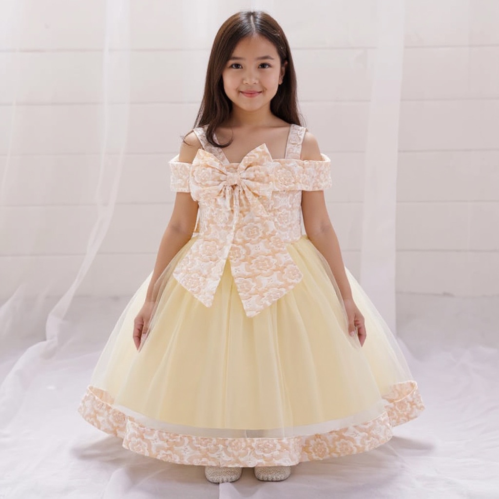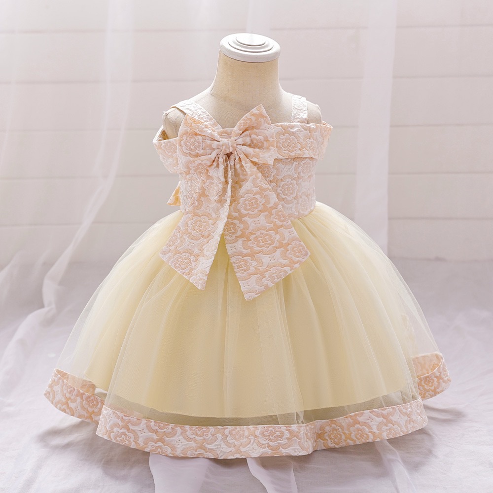 Setul include și rochița pentru fetițe 3-6 luni, realizată într-un stil de ocazie, cu fustă amplă din tulle în nuanță crem/ivory. Partea de sus este completată de un material cu model tip dantelă/brocadă în tonuri delicate, iar elementul care atrage imediat atenția este funda mare, amplasată în partea frontală, care oferă rochiței acel aer de “prințesă” potrivit pentru botez. Tivul fustei este conturat cu bandă decorativă asortată, astfel încât rochița arată impecabil în poze și la purtare. Acest detaliu este important dacă îți dorești o ținută completă, gata de eveniment, fără să mai cauți separat piese care să se potrivească cromatic.