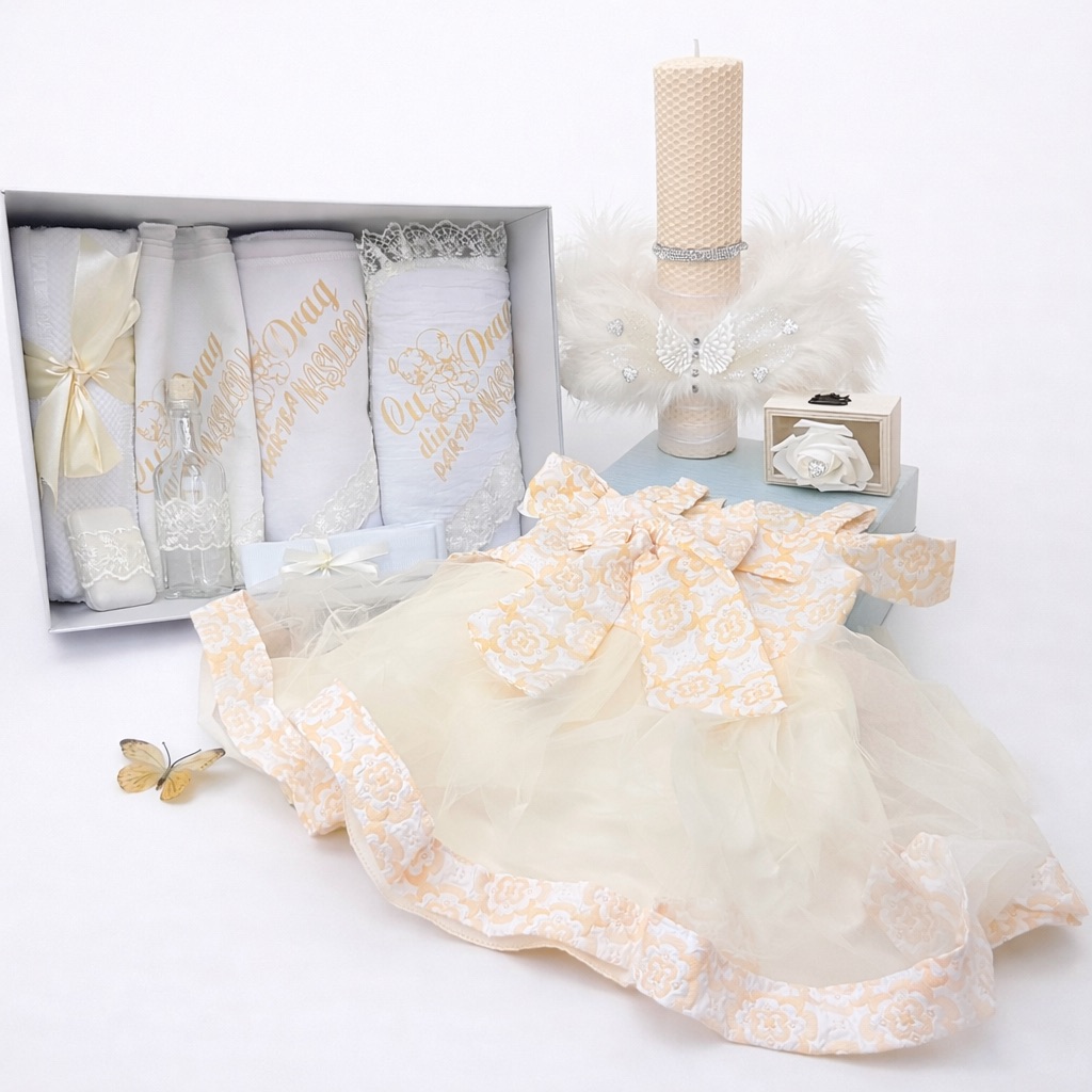 Trusoul este prezentat într-o cutie elegantă, cu aspect festiv, potrivită pentru oferit cadou din partea nașilor sau a familiei. Ambalarea și aranjarea pieselor sunt atent realizate, astfel încât întregul set să fie gata de eveniment imediat ce ajunge la tine. Paleta crem-auriu, împreună cu elementele albe, creează un stil cald, luminos și foarte potrivit pentru o ceremonie de botez, mai ales dacă îți dorești un decor cu note clasice, rafinate.