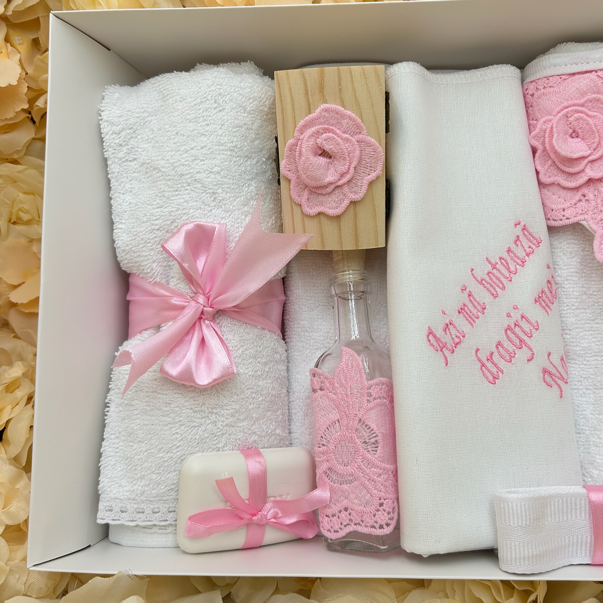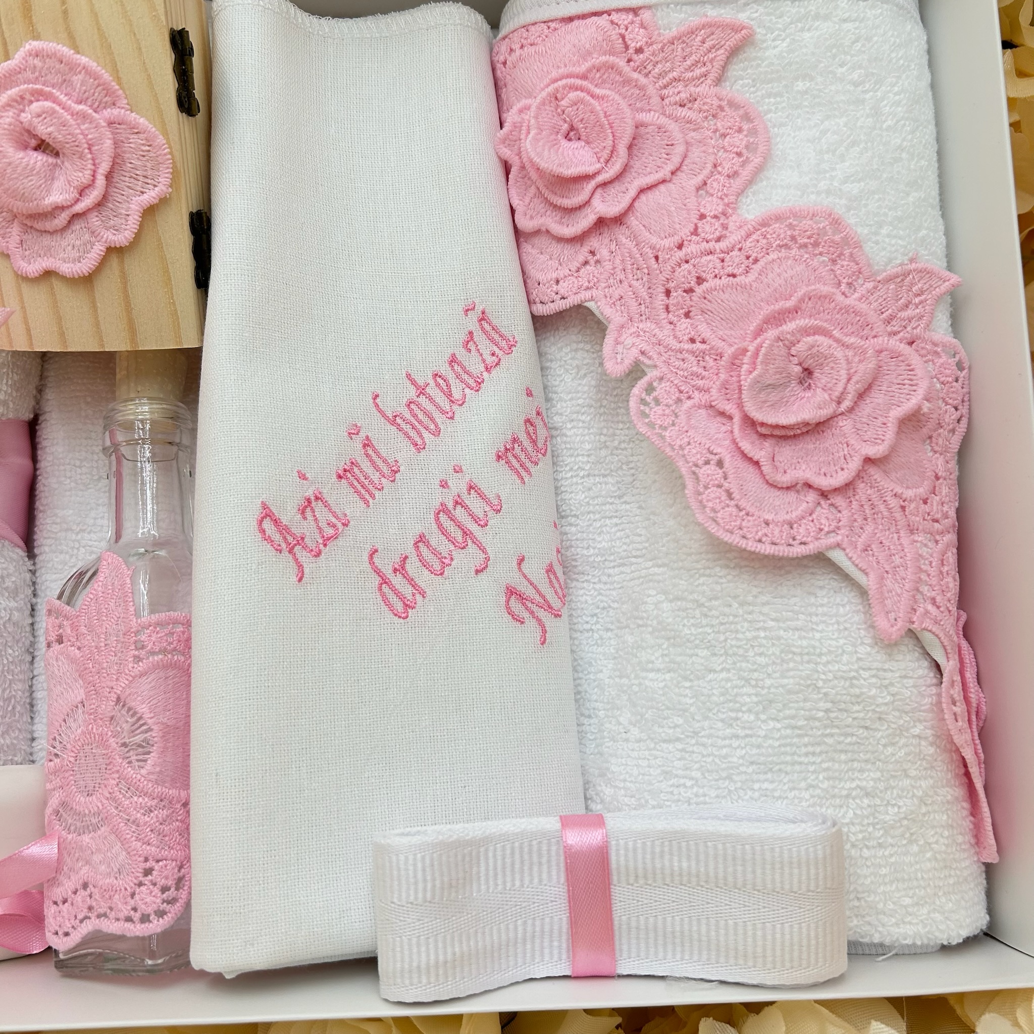 Trusou botez fetițe cu dantelă roz – prosop bebe, pânză de mir, prosop preot, fașă, săpun, sticluță mir și cutie prima șuviță | Set complet elegant