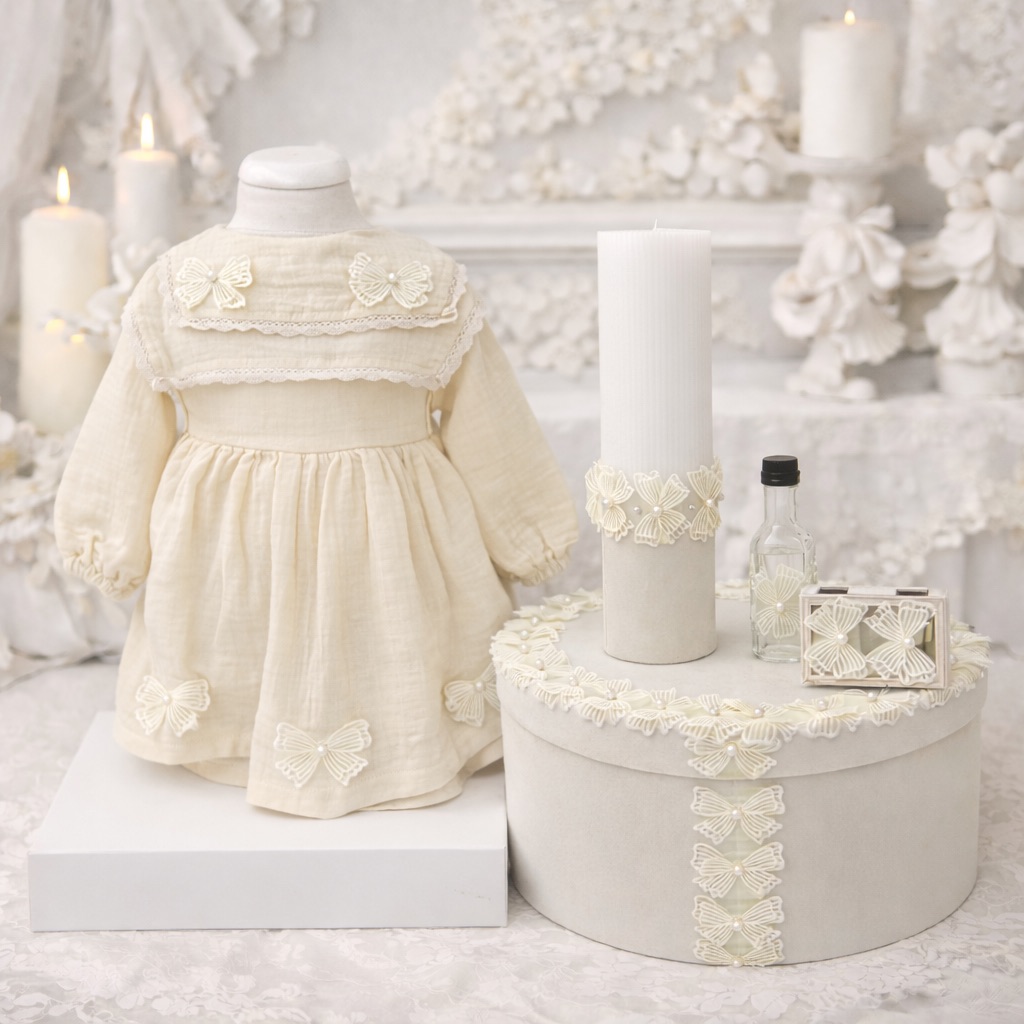 Trusou complet de botez pentru bebeluși – crem elegant, lucrat manual, cu rochiță din muselină și lumânare tematică