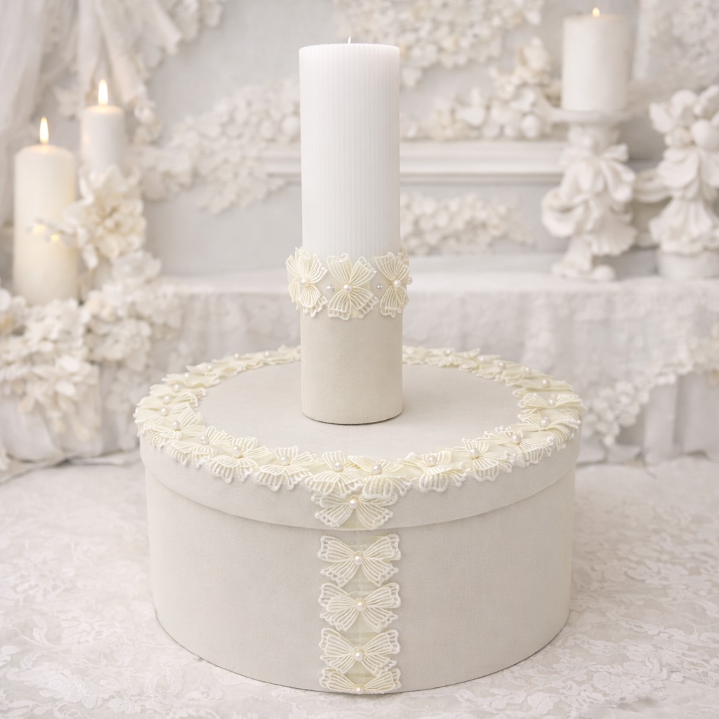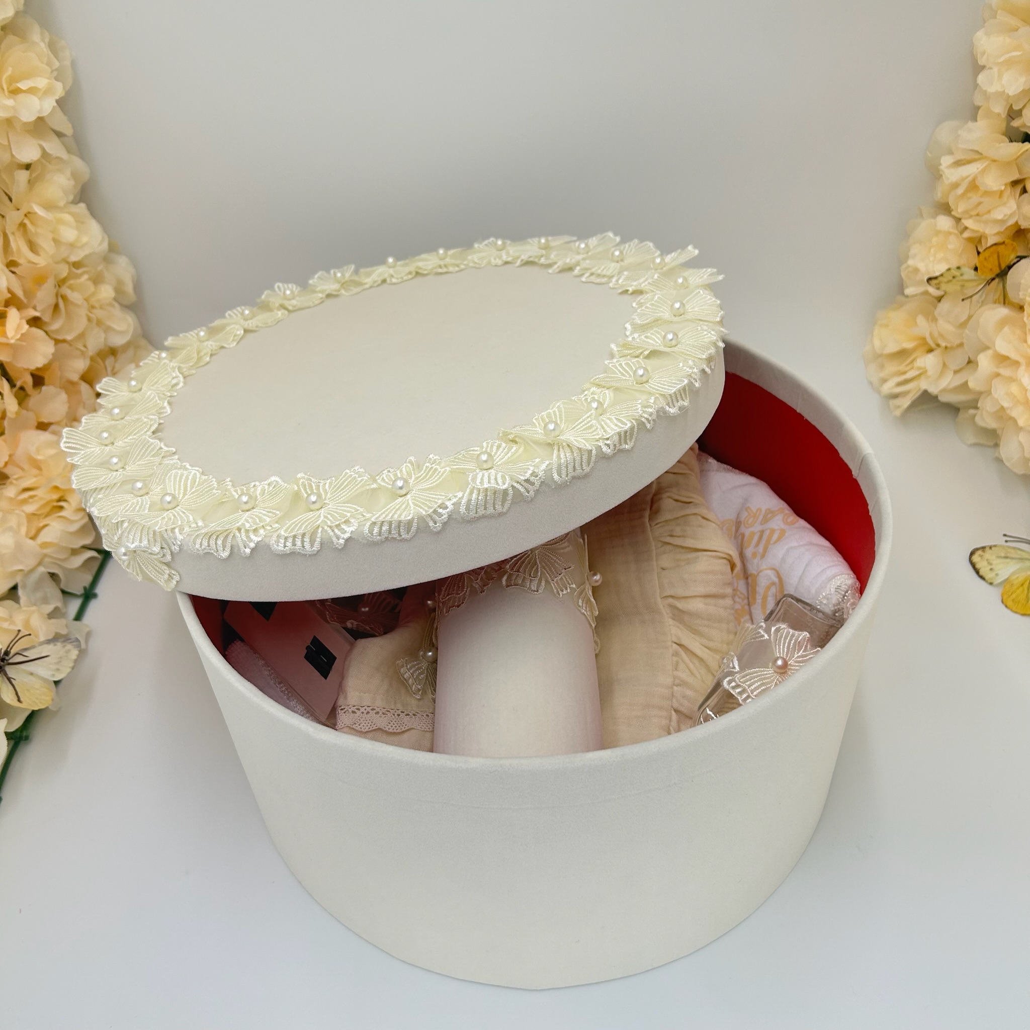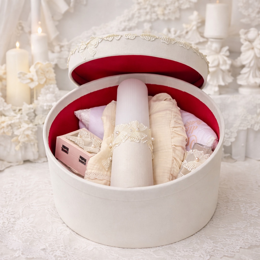 Întregul set este prezentat într-o cutie rotundă, realizată manual, îmbrăcată într-un material textil fin, cu interior contrastant și decorată cu aplicații delicate tip fundițe textile și perle. Cutia nu este doar un ambalaj, ci un obiect decorativ deosebit, perfect pentru păstrarea amintirilor de botez ale copilului. Capacul este decorat manual, iar finisajele sunt atent realizate, pentru un aspect premium.