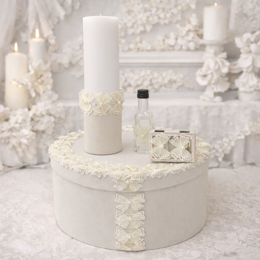 Lumânarea de botez inclusă în trusou este realizată manual, în tematica setului, cu un design elegant și delicat. Aceasta este decorată cu aplicații textile tip fluture, perle fine și detalii atent poziționate, oferind un simbol puternic al purității, luminii și protecției divine. Lumânarea este potrivită pentru ceremonia religioasă și are un aspect deosebit, fiind gândită să se integreze perfect în estetica trusoului. La cerere, lumânarea poate fi personalizată cu numele copilului și data botezului, transformând-o într-un obiect unic și cu valoare sentimentală.