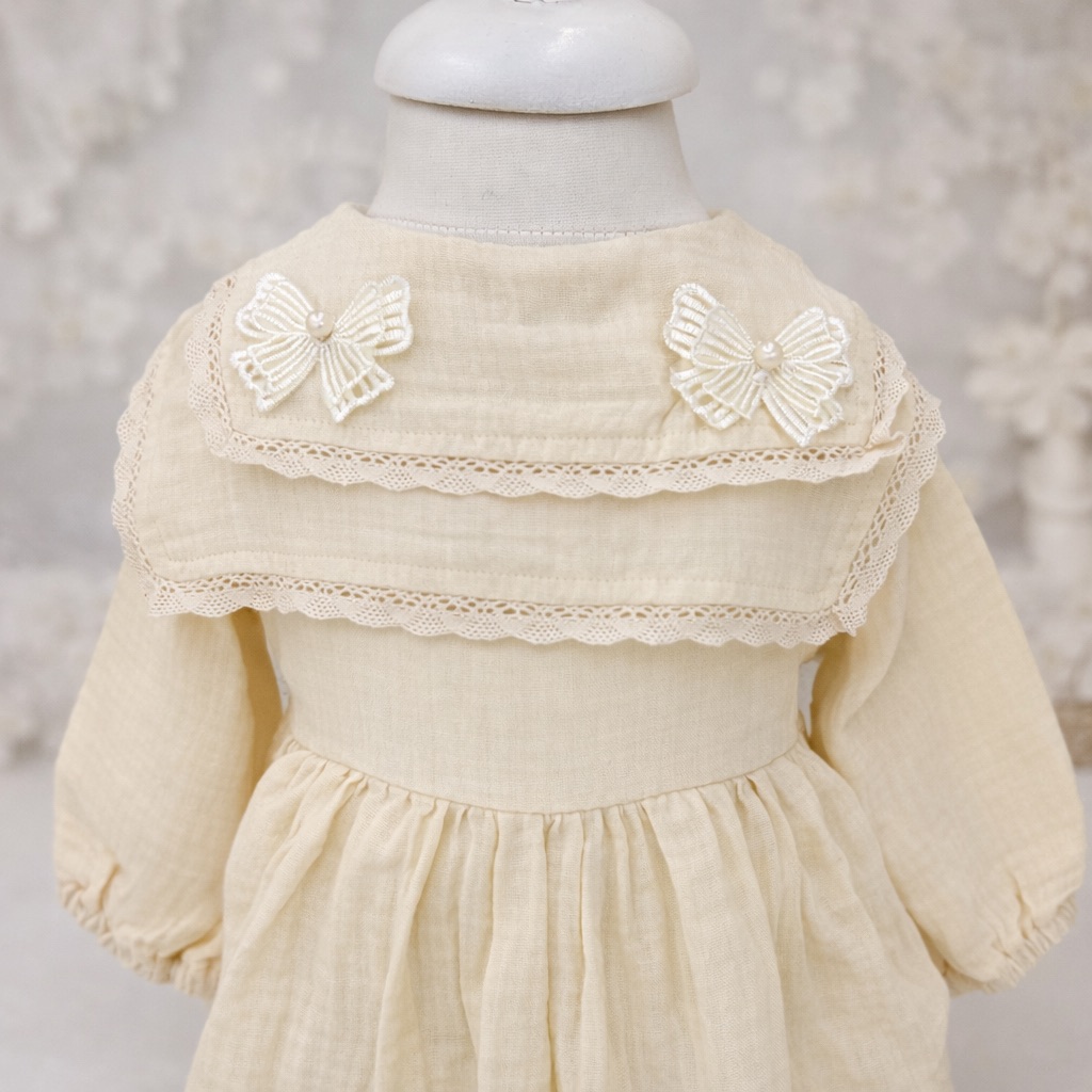 Rochița pentru fetiță inclusă în trusou este realizată din muselină de calitate superioară, un material natural, ușor și delicat cu pielea sensibilă a bebelușului. Designul rochiței este unul elegant și rafinat, cu mâneci lungi, croială lejeră și detalii fine din dantelă și aplicații decorative în ton cu restul trusoului. Rochița este ideală pentru ceremonie, oferind confort copilului și un aspect deosebit în fotografii și momentele speciale ale zilei botezului.